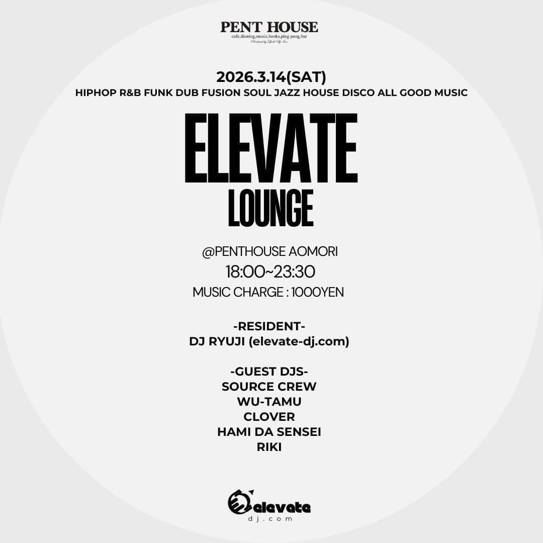| 2026.2.14 | Second Saturday of every month ELEVATE LOUNGE 開催 2026.6.13(SAT) -Resident- DJ RYUJI (elevate-dj.com) -GUEST DJs- DJ JIN (RHYMESTER)/breakthrough DJ TARAANI QUROVER MASASHI.N RAFFA -DJ/producer/remixer |